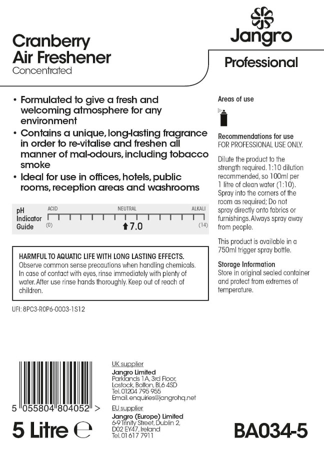 Jangro Cranberry Air Freshener is specifically designed to give a fresh and welcoming atmosphere to any environment. It contains a unique, long-lasting fragrance to re-vitalise and freshen all manner of malodours, including tobacco smoke.