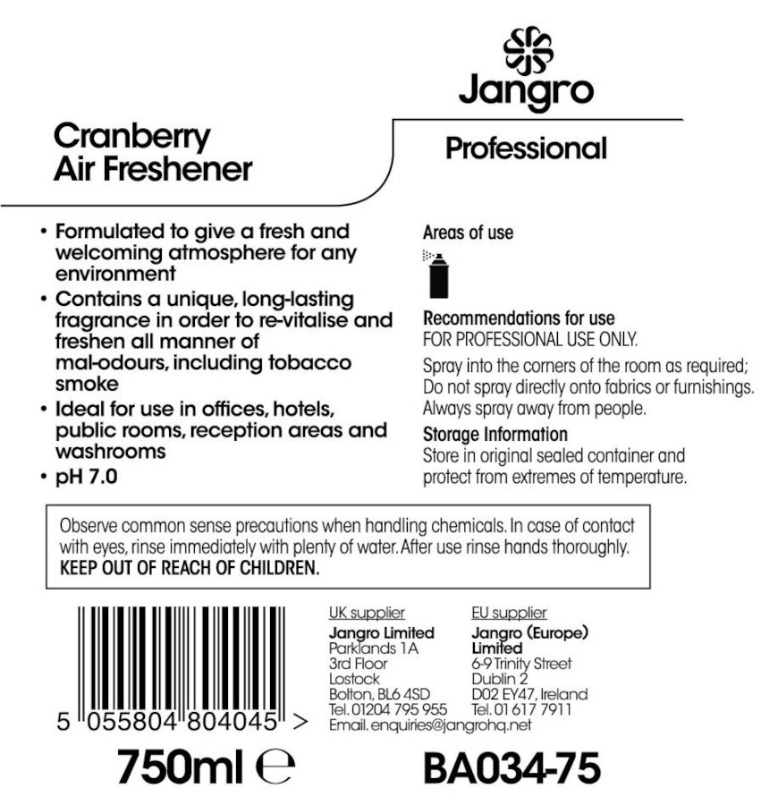 Jangro Cranberry Air Freshener is specifically designed to give a fresh and welcoming atmosphere to any environment. It contains a unique, long-lasting fragrance to re-vitalise and freshen all manner of malodours, including tobacco smoke.