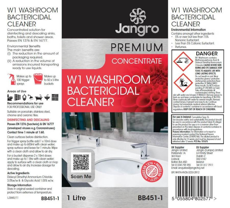 Jangro Premium W1 Washroom Bactericidal Cleaner – 1L